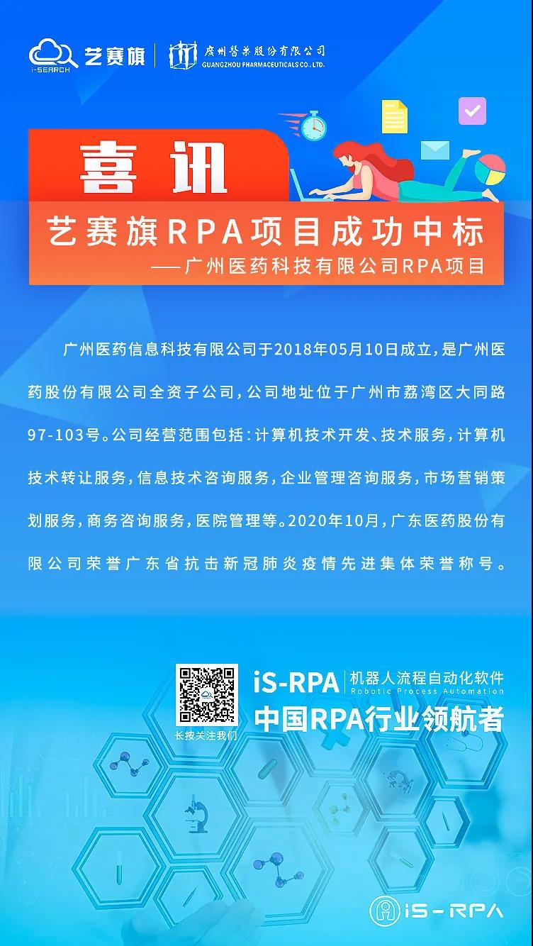近日,藝賽旗取得醫藥制造業行業客戶重大突破,中標成為廣州醫藥信息科技有限公司(廣州醫藥股份有限公司全資子公司) RPA供應商。