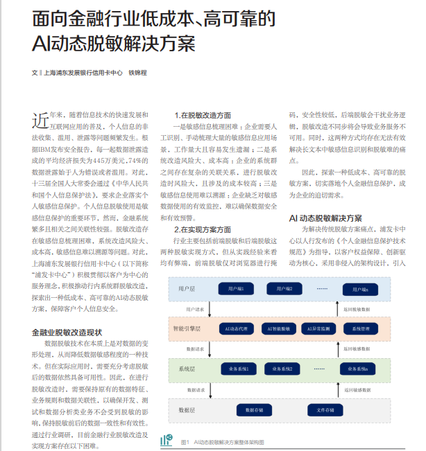 近期,在《金融電子化》雜志的2023年11月刊中,上海浦東發展銀行股份有限公司信用卡中心 副總經理 鐵錦程發表了題為《面向金融行業低成本、高可靠的AI動態脫敏解決方案》的文章。