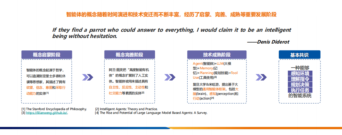 智能體的概念起源于哲學,經歷了從啟蒙到完善再到成熟的重要發展階段。董曉飛先生指出,智能體如今已被業界廣泛定義為一種能夠感知環境、理解指令、規劃決策并執行任務的智能系統。這一概念隨著技術變遷不斷豐富,從阿蘭·圖靈提出的“高度智能有機體”擴展至具有自主性、反應性、主動性和社交能力的實體。