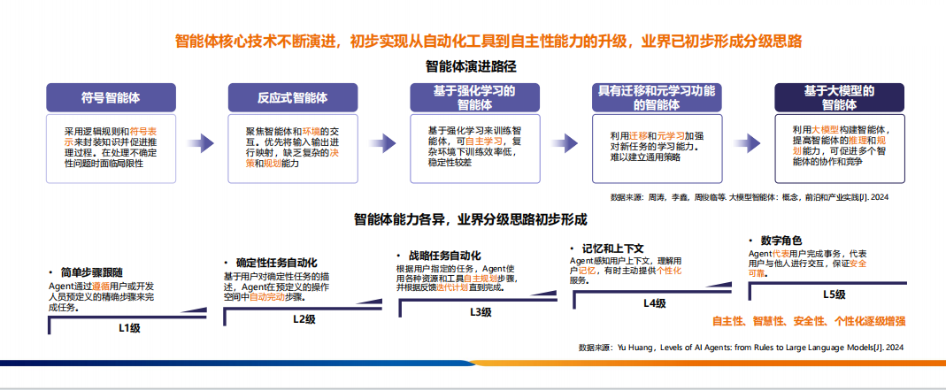 在發展歷程方面,智能體技術持續演進,符號智能體、反應式智能體、基于強化學習的智能體等相繼出現。近年來,隨著大模型的興起,基于大模型的智能體已成為主流,實現了從自動化工具到自主性能力的升級。