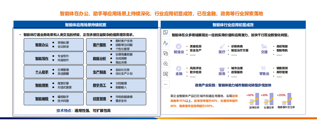 此外,董曉飛先生還介紹了智能體在辦公、助手等應用場景上的持續深化,以及在金融、政務等行業的探索落地。智能體在表格處理、會議轉錄、客戶服務、智能寫作、數據分析等方面展現出強大的應用能力,有效提升了業務效率和服務質量。