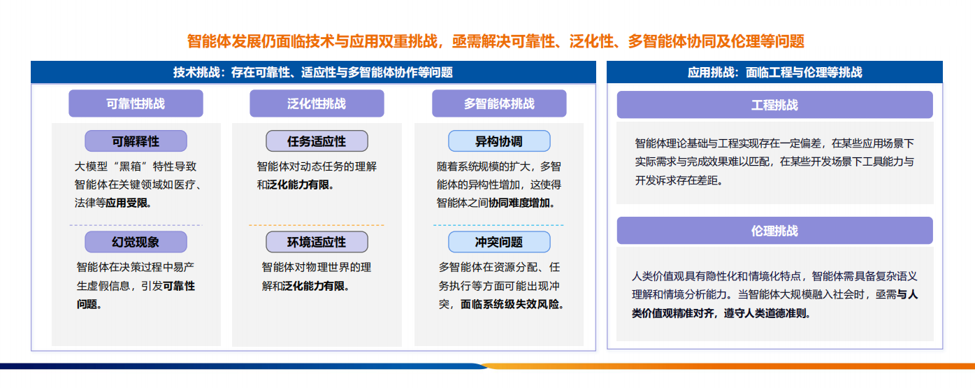 然而,智能體發展仍面臨技術與應用雙重挑戰。在可靠性方面,智能體在決策過程中易產生虛假信息,引發可靠性問題。在泛化性方面,智能體對動態任務和物理世界的理解和泛化能力有限。此外,多智能體協同也面臨異構協調沖突和系統級失效風險等問題。倫理挑戰同樣不容忽視,智能體需與人類價值觀精準對齊,遵守人類道德準則。