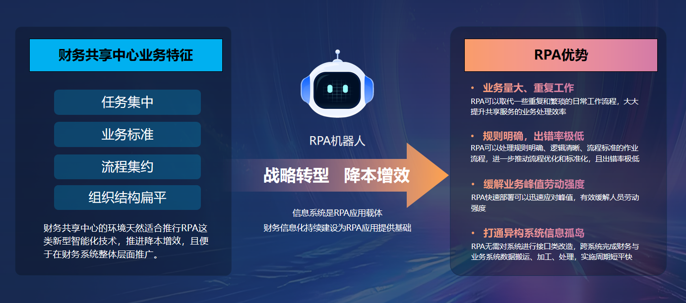 為應對這些挑戰,上海機場引入了 RPA(流程自動化)技術。RPA 在解決業務峰值、重復操作等問題上具有獨特優勢,恰好契合財務共享中心任務集中、業務標準、流程集約、組織結構扁平的環境。