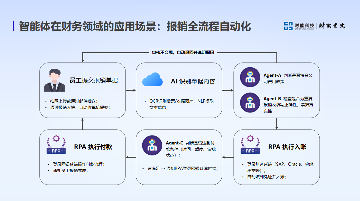 例如,在報銷全流程自動化中,智能體能夠自動判斷報銷單據的合規性,并與RPA配合,自動執行入賬、制證和付款等操作,大大提高了報銷效率。