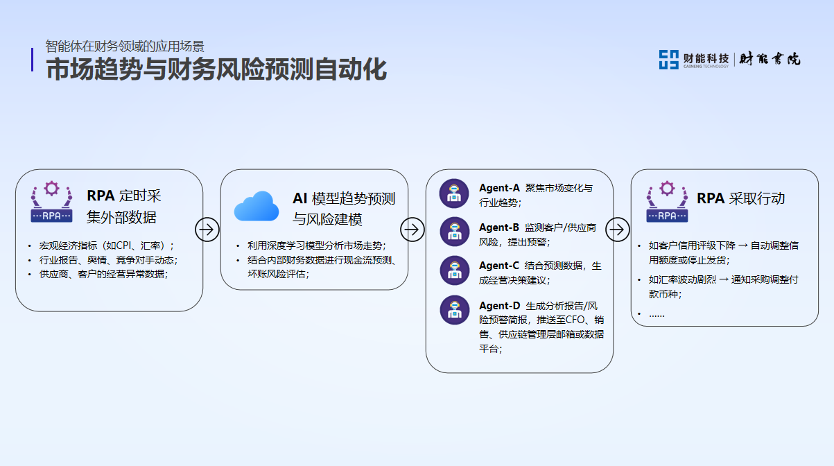 在市場趨勢與財務風險預測自動化中,智能體利用深度學習模型分析市場趨勢,結合內部財務數據進行現金流預測以及壞賬風險評估,如客戶信用評級下架,觸發RPA自動調整信用額度或停止發貨;如匯率波動劇烈,觸發RPA通知采購及時調整付款幣種。