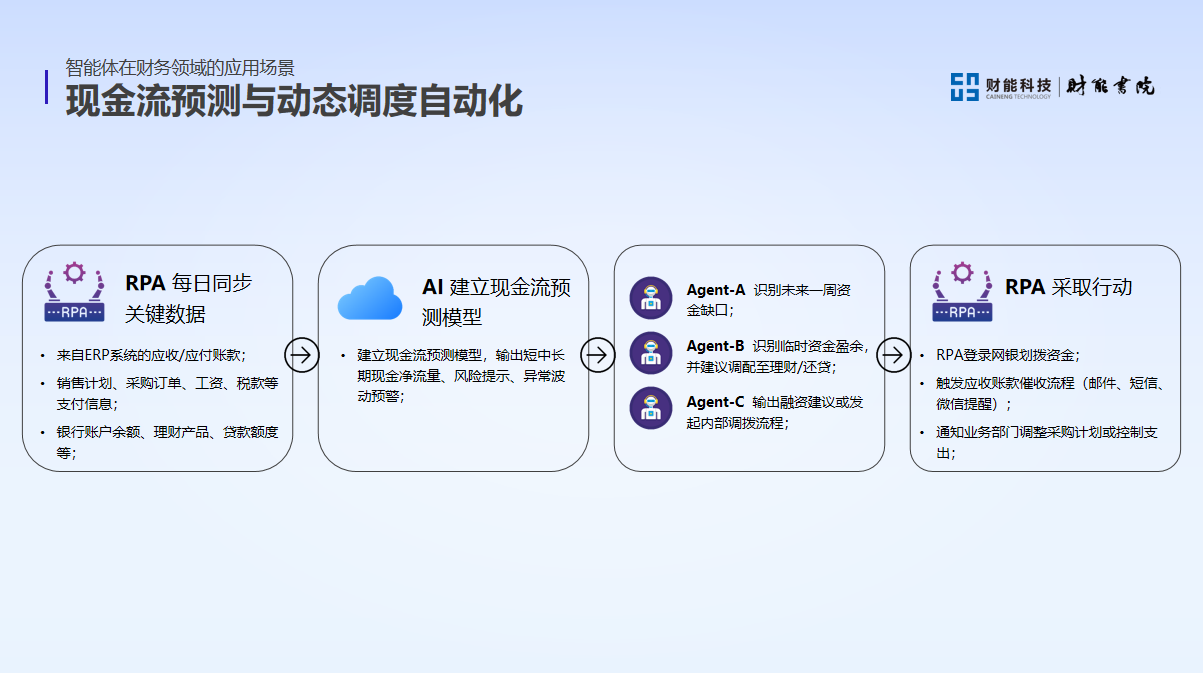 在現金流預測與動態調度自動化中,智能體如識別出臨時資金盈余,可給出調配至理財或還貸等建議,觸發RPA執行資金劃撥、應收賬款催收流程等操作。