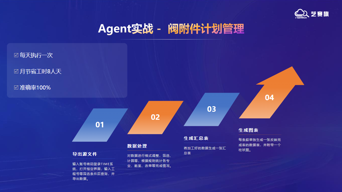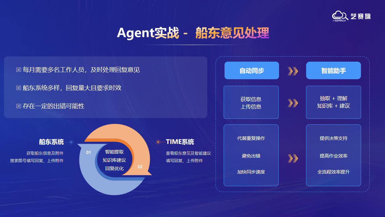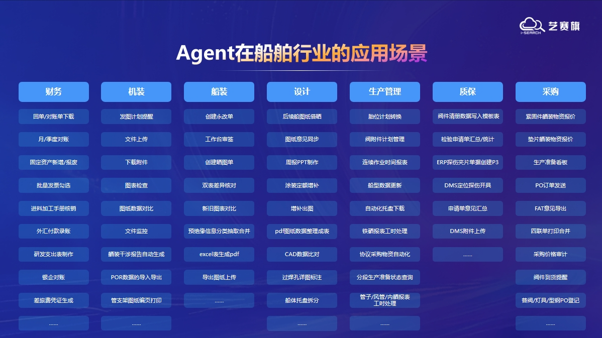 楊勇在演講中指出,大模型浪潮正推動全球生產力從 “信息化→數字化→數智化” 躍遷,AI 2.0 時代的核心突破在于智能體(Agent) 對人機協作模式的重構。藝賽旗 AI Agent解決方案已服務滬東中華造船、上海外高橋造船等船企,在船舶行業機裝、船裝、設計、生產管理、質保、采購、財務等核心場景落地,其中特別分享了船東意見處理、設備故障診斷、閥附件計劃管理等具體案例。