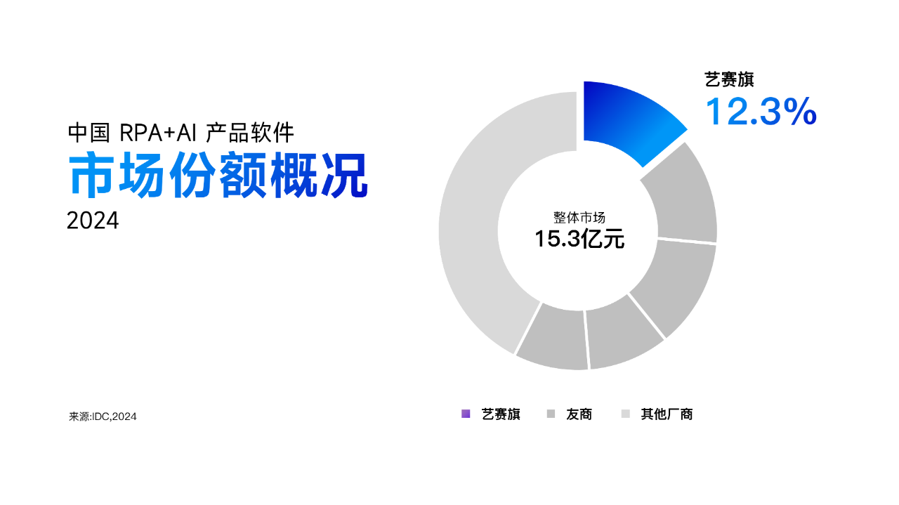 IDC報告顯示,盡管2024年中國RPA+AI市場競爭格局因AI Agent技術的爆發而趨于分散,藝賽旗仍憑借其在企業級流程智能體平臺方面的卓越表現,以12.3%的份額拔得頭籌,成功領跑中國RPA+AI產品市場。